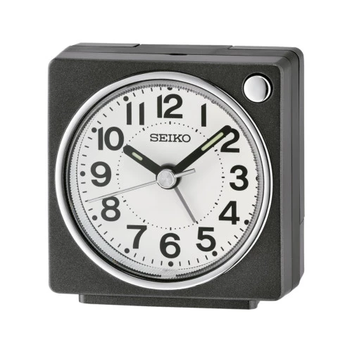 Reloj Seiko despertador QHE196K en negro. Reloj con caja de plástico cuadrado en negro. Botón en el frontal para luz y snooze. Despertador cuadrado esfera en blanco con números arábigos, y agujas en negro, segundero en plateado de barrido silencioso, y alarma en plateado. Alarma zumbador de repetición. Medida del despertador 3,6 x 6,6 x 6,4cm. Garantía oficial Seiko