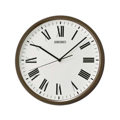 Reloj Seiko pared qha009b. Caja de plástico de calidad en marrón con esfera en blanco con números romanos. Medidas de 30,5 cm diámetro, 4,5 cm de grueso. Garantía oficial Seiko