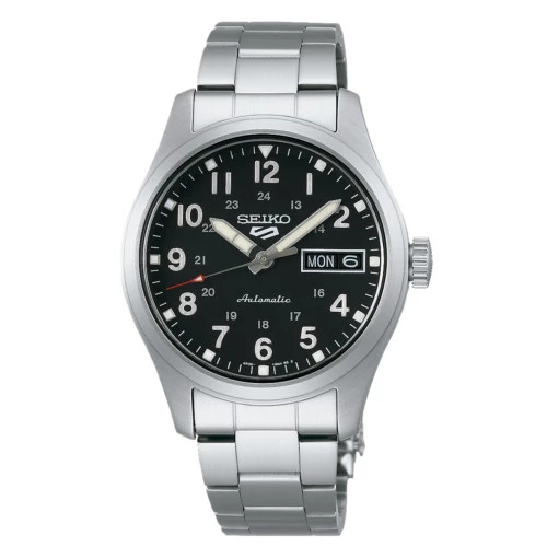 Reloj Seiko 5 SRPJ81K1 automático 36 mm military. Reloj Seiko con calibre 4r36, detención parada de segundero. Automático, 24 rubíes, 21.600 alternancias por hora con 41 horas de reserva de carga. Esfera negra, tres agujas, agujas e índices números arábigos luminiscentes, doble calendario en la posición de las tres. Caja de acero con corona cambio de hora y fecha en la posición de las tres, brazalete de acero con cierre desplegable, fondo cerrado a rosca caja transparente. Cristal Hardlex. Resistente al agua 100 metros. Diámetro de la caja 36 milímetros. Estuche y garantía oficial Seiko