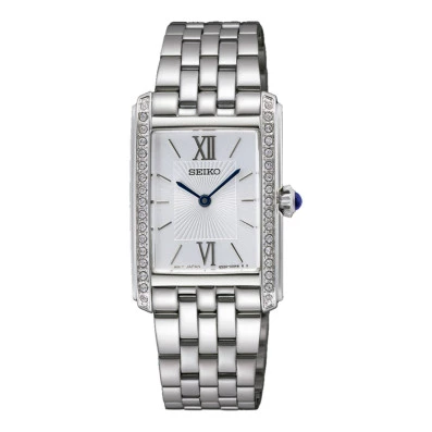Reloj Seiko SWR091P1 rectangular colección Ladies para mujer con calibre 4n30 made Japan. Caja con bisel con piedras y brazalete de acero con cierre mariposa con botón de seguridad Seiko. Corona cambio de hora con joya azul. Esfera en blanco con índices números romanos y agujas en azul. Resistente al agua 50 metros. Medida de caja 22,5 milímetros. Estuche y garantía oficial Seiko